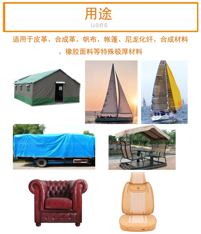 用途:適用于皮革、合成革、帆布、帳篷、尼龍化纖、合成材料、橡膠面料等特殊極厚素材;適用縫制船帆帳篷、坐墊、家具沙發、遮陽傘、卡車篷罩等大型特殊極厚料產品。